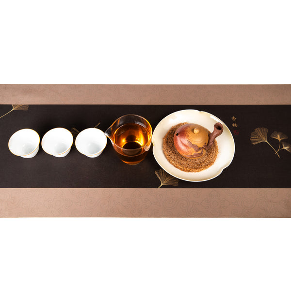 This tea table runner features a dark-brown (almost black) central panel framed by soft beige borders. Delicate, gold-printed ginkgo leaves are scattered along its length, bringing a sense of artistry and beauty without dominating or distracting. The color contrast works well with most teaware styles, from unglazed, earthy Yixing clay to celadon and white porcelain. The surface has a smooth, matte finish that feels pleasant to the hands.