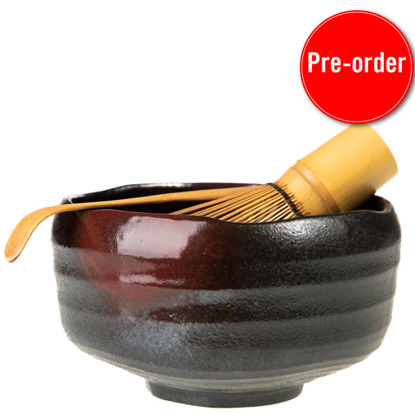 This matcha set is designed around a Tenmoku-style chawan called the Akafuki. The "Sunset" Akafuki Chawan is a deep, wide bowl with a rich, dark glaze – a blend of tradition and modern Japanese pottery design. The glaze features a red spray (hence "Akafuki," literally "red‑sprayed") that shifts from deep crimson to burgundy, depending on the light – this hue fades into the signature dark surface of Tenmoku ware.
